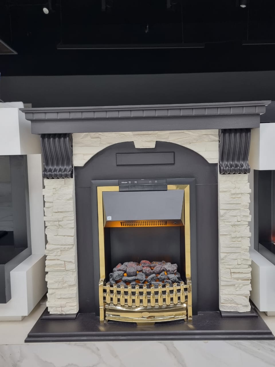 Вместо классических поленьев в очаге используется имитация тлеющих углей.